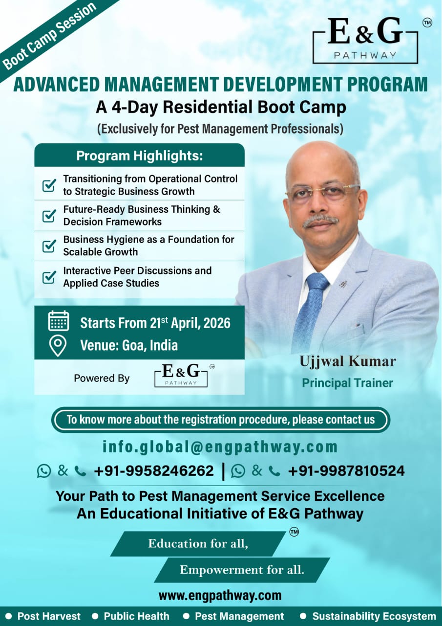We are pleased to announce our upcoming Advanced Management Development Program (AMDP) โ a 4-Day Residential Boot Camp designed exclusively for Pest Management Professionals, scheduled to commence on 21st April 2026 in Goa, India.