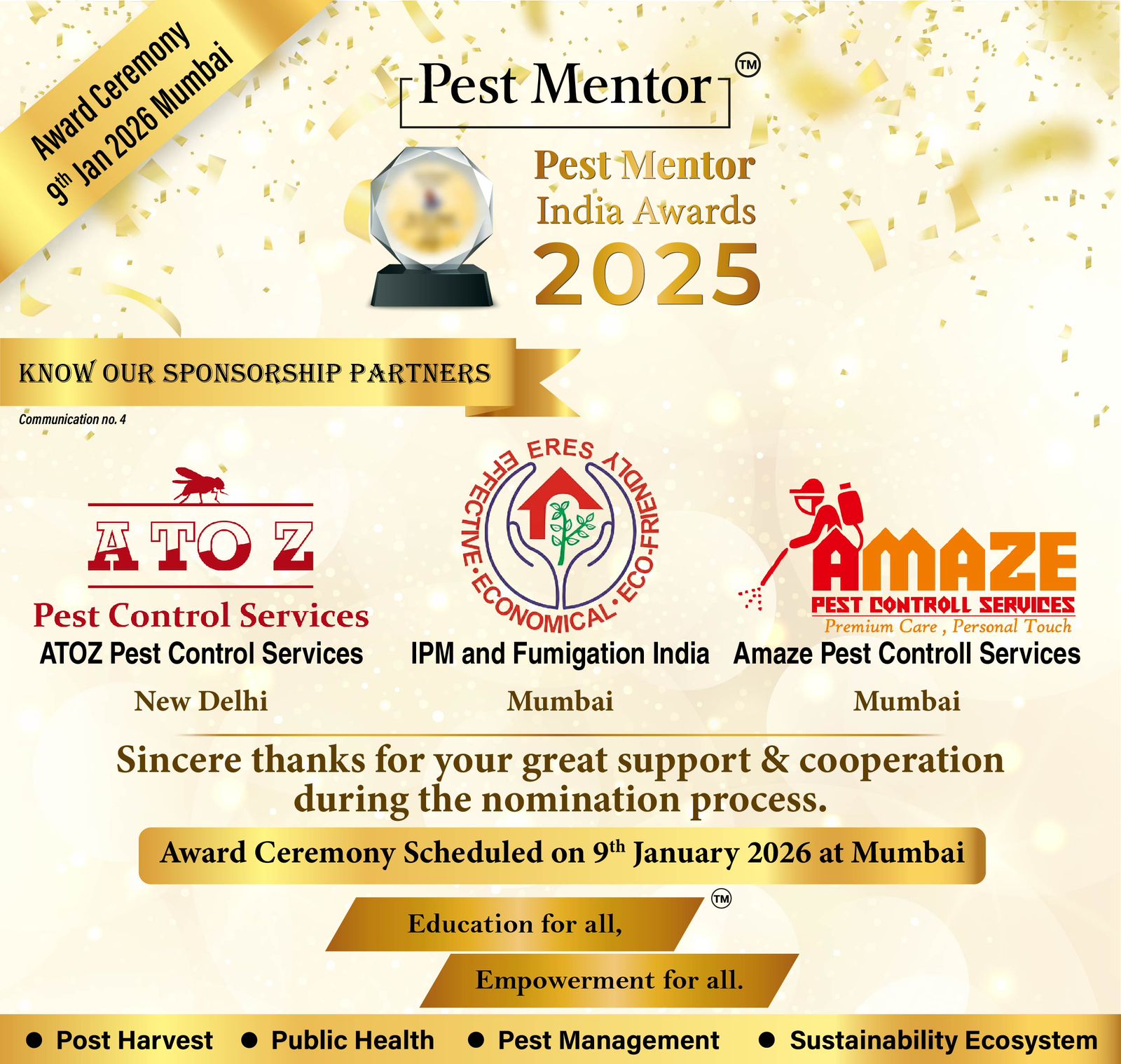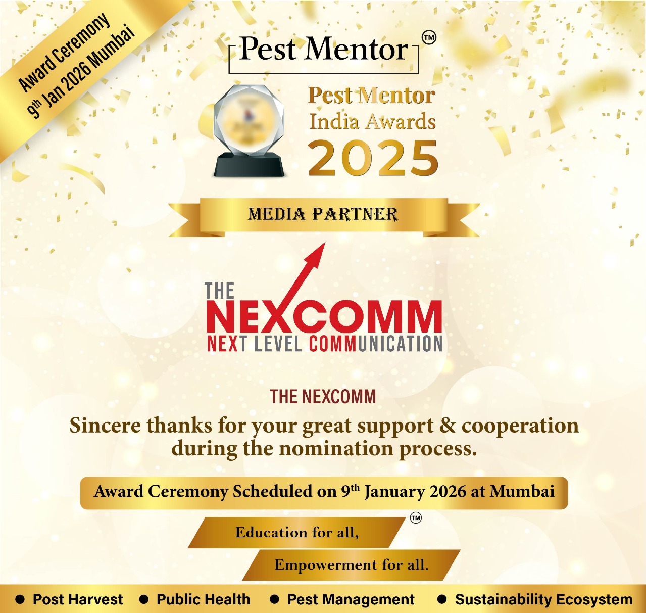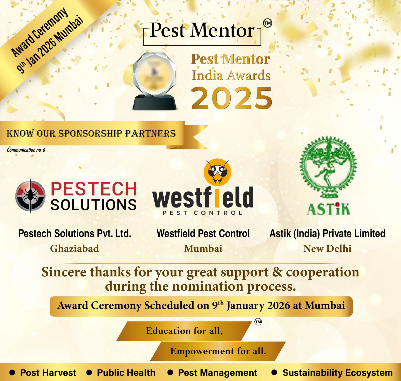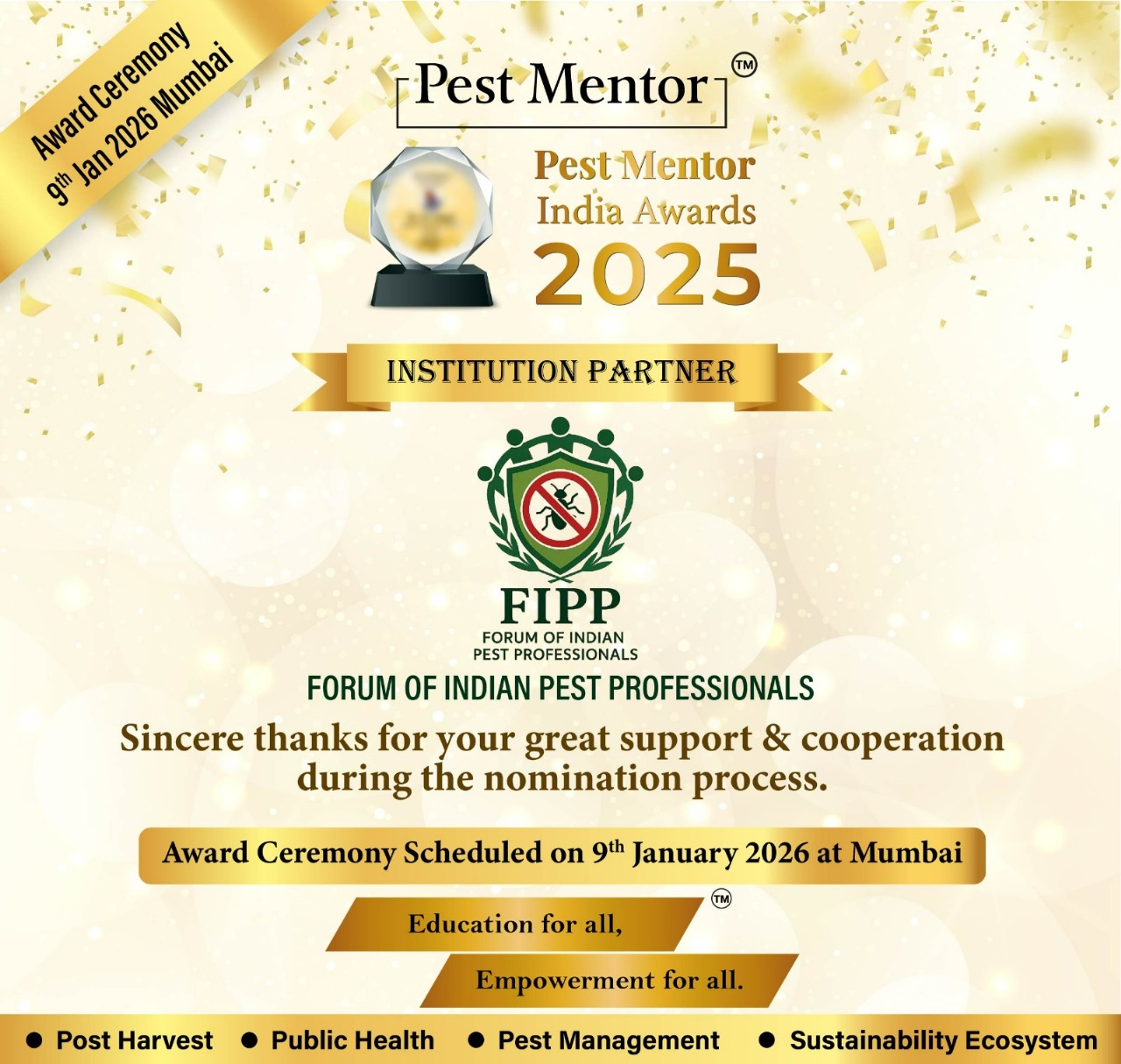 Happy to share that the nomination process and Jury evaluation for the Pest Mentor India Awards 2025 have been successfully completed.
