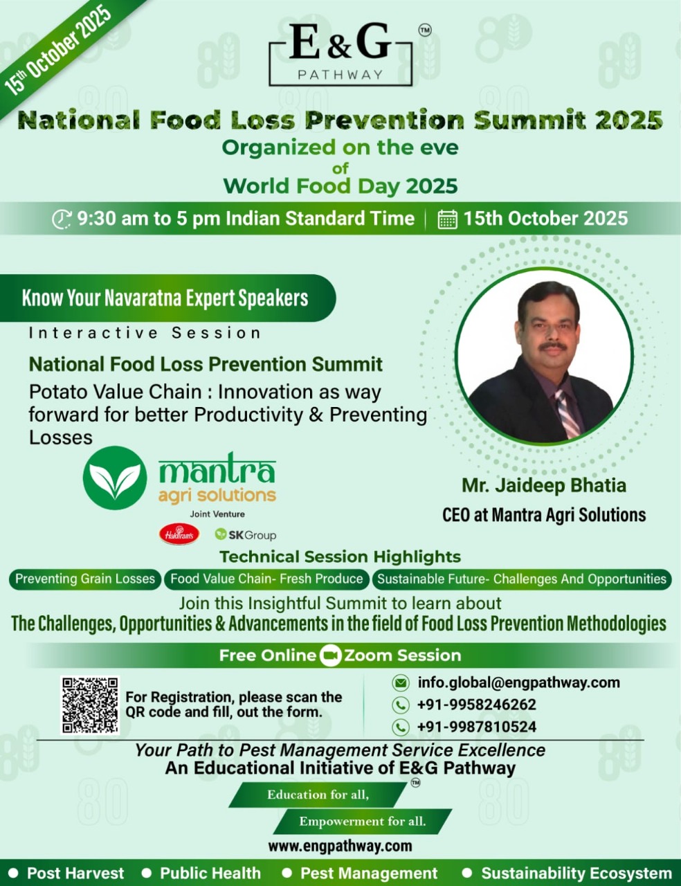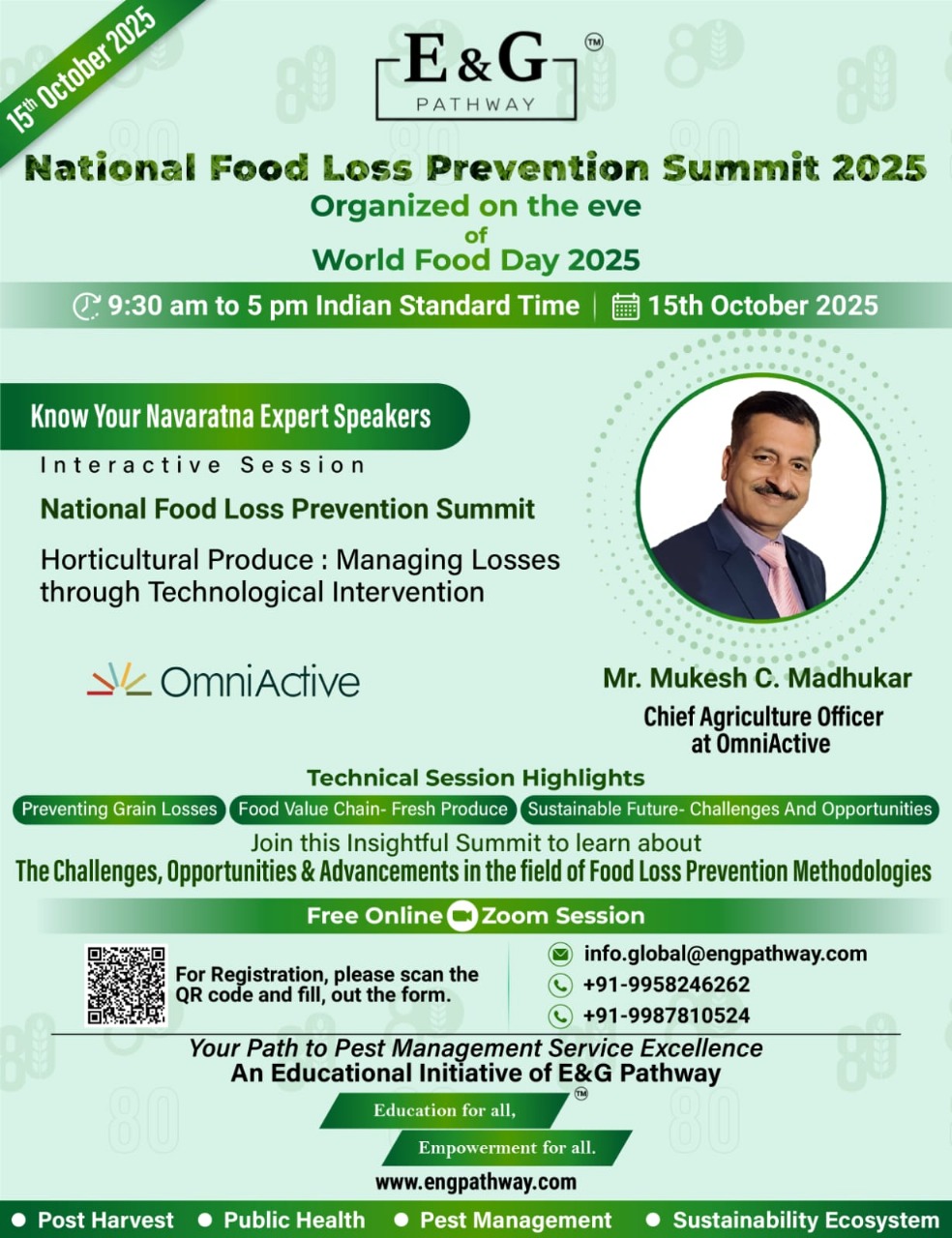 Join the National Food Loss Prevention Summit 2025 by E&G Pathway on World Food Day (15th October 2025) to hear from Mr. Mukesh C. Madhukar, Chief Agriculture Officer at OmniActive.