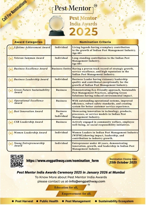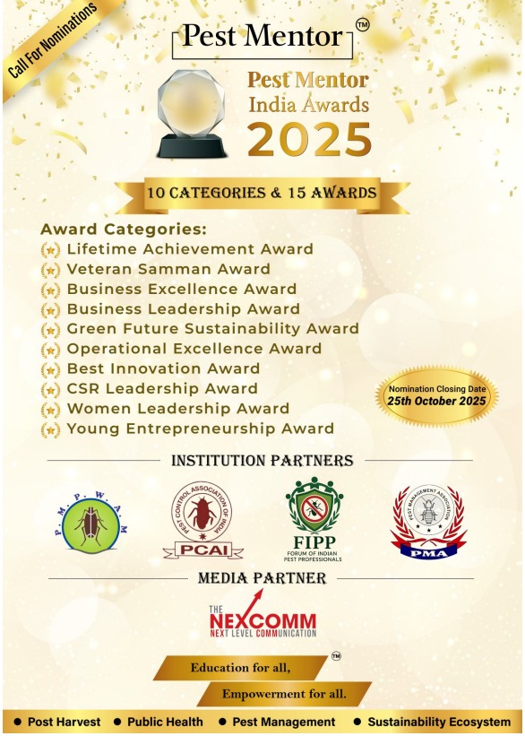We are pleased to announce the Pest Mentor India Awards 2025, an initiative to honour exemplary contributions to the growth and advancement of the Indian Pest Control Industry.